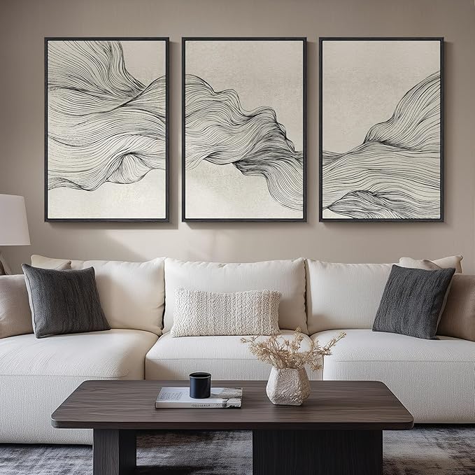 - [As Great As The Picture]: These paintings feature delicate line art with dynamic black wavy lines against a versatile beige background. Suitable for modern, minimalist, or luxurious home styles, they enhance the artistic atmosphere of any space, including living room, hallway, stairwell, dining room, bedroom, lounge, meeting room, and office. Add a unique touch to your home with these elegant artwork