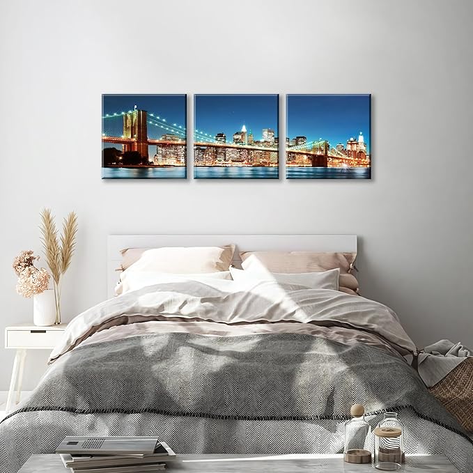 NAN Wind 3PCS Brooklyn Bridge Canvas Art Illuminated NYC Skyline with City Lights Wall Decor Modern Manhattan Night View Panoramic Prints Contemporary Water Reflection Canvas Set for Living Room
