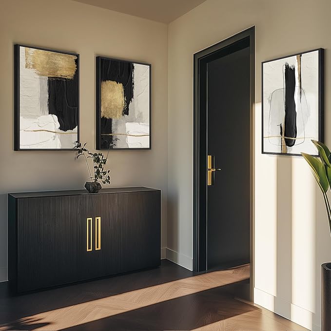 - [Framed Wall art]: A set of 3 large contemporary minimalist black white and gold abstract wall art each 24x36 inches, 3 pieces totaling 36" H x 72" W. The frame is sturdy and the simple and stylish black frame blends perfectly with a variety of decorative styles