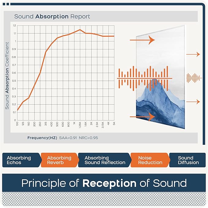 - đ»ăSound Absorbingă Our art acoustic panels which can easily and effectively reduce reverberation diffusion and echo, absorbing noise for walls. Effectively improve your sound environment and quality.Absorption Frequency: 150-20000HZ.It has better effect than acoustic foam
