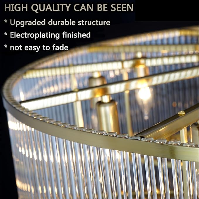 - 【Modern Large Chandelier】High ceiling waterfall chandelier brass round glass chandeliers. Features a sleek electroplated brass finish frame along with 5-tier clear glass rods, creating a dramatic play of light and a softly diffused glow. Just to give a luxury presence to your sweet home!
