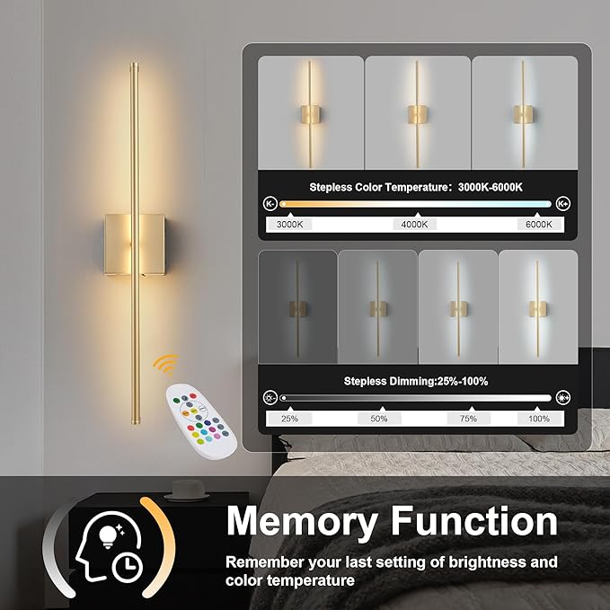 - Your Personal Lighting Director: Command your ambiance with the included remote. These dimmable wall sconces let you fine-tune brightness, switch between Warm light(3000K), Natural light (4000K), White light (6000K) and vibrant 9 RGB colors, or set a timer. Perfect for winding down with a book or setting the mood for a cozy evening