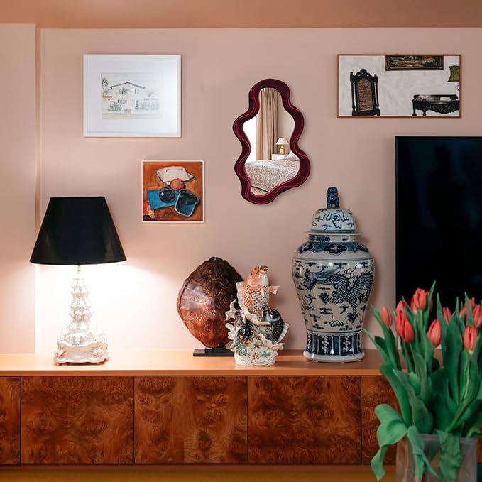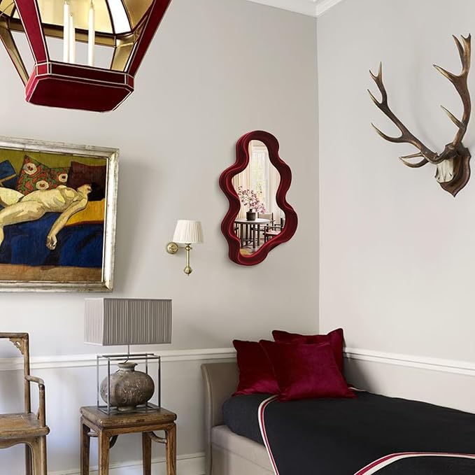 Mirror Wall Decor for Home Office Apartment, Asymmetrical Decorative Mirror for Entryway Porch Fireplace, Irregular Hanging Wall Art Sculpture for Christmas (Wine Red)
