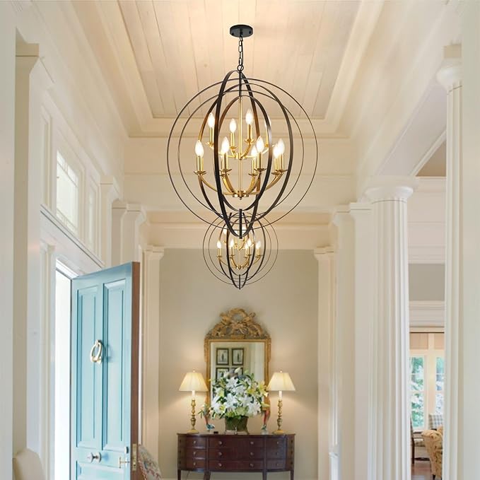 Black and Gold Chandelier, 12-Light Farmhouse Chandelier for Entryway, 31.5" Extra Large Round Pendant Light Fixtures, Foyer Chandeliers for High Ceilings, Rustic Ceiling Foyer Lighting Fixtures