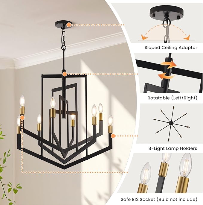 Black and Gold Chandelier,8-Light Modern Geometric Pendant Light Fixtures,Rustic Industrial Foyer Lighting Fixtures, Large Foyer Chandeliers for High Ceilings, Farmhouse Chandelier for Entryway