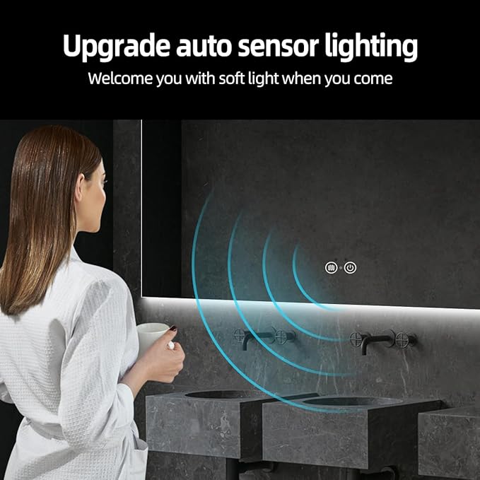 - 【Automatic Lighting Feature】: This led bathroom mirror comes with an infrared sensor that turns on the lights automatically when you approach it. After you leave, the lights will turn off by themselves after 10 seconds. This feature is very convenient and helps prevent smudges from touching the mirror. Of course, you can also control the lights using the touch switch.