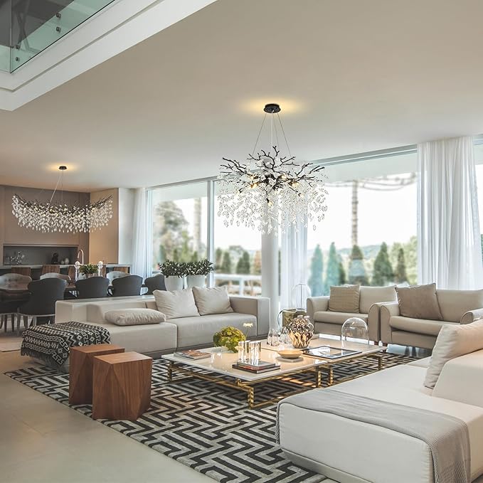 - 【Adjustable Height】Worried about your ceiling height? Fear not! This round modern chandelier features an adjustable cable and suitable for sloped or Vaulted ceiling, making branch crystal chandelier the perfect fit for both cozy nooks and grand spaces. Whether you’re throwing a dinner party or enjoying a quiet night in, you’ll have the perfect lighting—no more bumping your head!