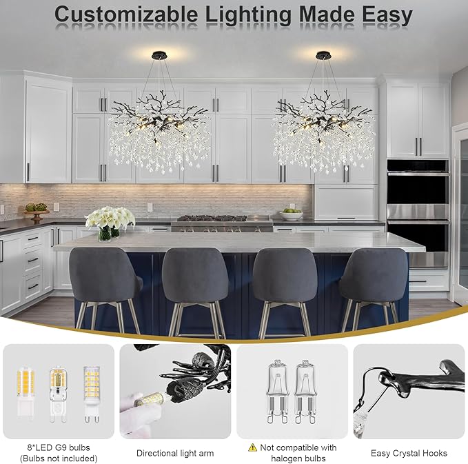 - 【Mood Lighting】Picture this: You’re entertaining guests and want to set the mood. Compatible with dimmable G9 bulbs (not included), this branch chandelier lets you customize the brightness to match your vibe—be it romantic, festive, or just plain fun. Enjoy dazzling black chandelier light fixture that transforms your space from ordinary to extraordinary!