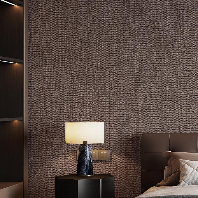 24"x393" Brown Grasscloth Peel and Stick Fabric Textured Contact Paper Linen Wallpaper Vintage Matte Frosted Waterproof Luxury Wallpaper for Bedroom Bathroom Kitchen (Dark Brown)