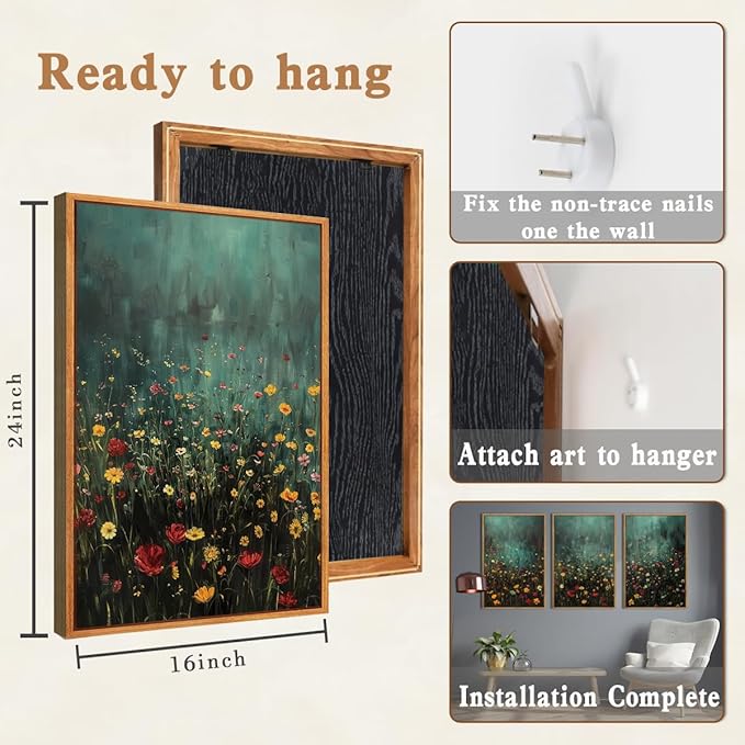 - 【Wildflower Wall Art Set】This set includes three charming floral wall art pieces, each sized at 16 x 24 inches. The canvases are evenly stretched on wood frames, with hooks on the back. Mounting hardware is provided, allowing for effortless hanging.