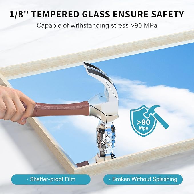 - QUALITY PRODUCTS & SERVICES - Upgraded packaging and four corner protectors safeguard the most vulnerable areas of the tempered glass, ensuring safe delivery. In the rare event of shipping damage, we offer hassle-free replacements without returns. Our commitment to quality extends beyond delivery with a comprehensive 3-year warranty, allowing you to enjoy your mirror daily with complete peace of mind.