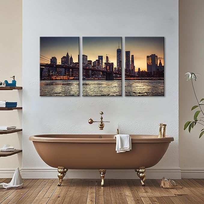 - STUNNING SUNSET CAPTURE - Set of 3 matching panels, each measuring 20x30 inches (total display area: 60x30 inches).Captures Brooklyn Bridge's majestic span against Manhattan's golden skyline. Freedom Tower stands prominently among illuminated skyscrapers. Rippling river reflections add captivating depth and dimension to composition.