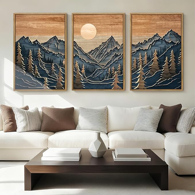 - 【Vintage Mountain Forest Wall Art】This set of three-piece wooden-framed mountain landscape decorative paintings skillfully combines retro tones with modern compositions. Using calm colors such as warm brown and dark green, it outlines a harmonious picture of overlapping mountains, a dense jungle, and the glimmer of dawn. The abstract strokes in the non-figurative style not only retain the wild charm of nature but also present a modern artistic sense through the three-dimensional layered cutting process. It is perfectly suitable for various spatial styles, including the living room, bedroom, or office.