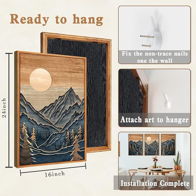 - 【Effortless Installation】It adopts a lightweight solid wood frame and pre-installed hardware hooks, allowing you to complete the installation on the wall within 3 minutes without additional tools. The built-in level on the back ensures a balanced hanging, and the included set of non-marking nails is suitable for different wall materials. Even renters can decorate their spaces as they like.