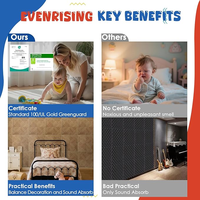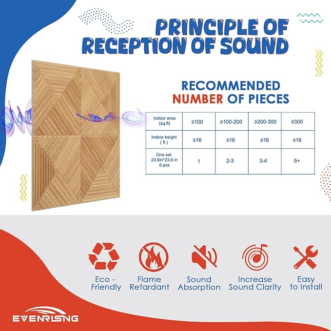 - ♻️【Upgraded Acoustic Features 】EVENRISING sound panels help reduce unwanted reflected sound in any room of your home or building, they are lightweight and are easy to mount on the wall, doors and ceiling. Help reduce background noise, echoes, reverberation time(RT), and decrease standing waves (that's what makes noisy studios or offices so bad).