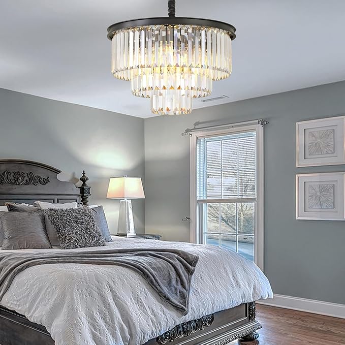 - [Modern Crystal Lighting Design]This stunning crystal chandelier seamlessly combines modern elegance with classic sophistication. Featuring a multi-tiered design of K9 crystal bars and a sleek, black metal frame, this pendant light fixture exudes timeless luxury. The cascading layers of sparkling crystal drops reflect light in every direction, creating a mesmerizing glow. Perfect for any room, whether as a dining room chandelier, living room ceiling light, or an entryway pendant, it adds a touch of grandeur to your home.