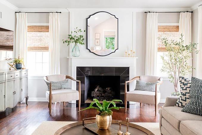 - 【Brief Arched Elegance】: Accent mirror captivates with its traditional arched scalloped design and antique black color, evoking the glamour of vintage decor pieces.