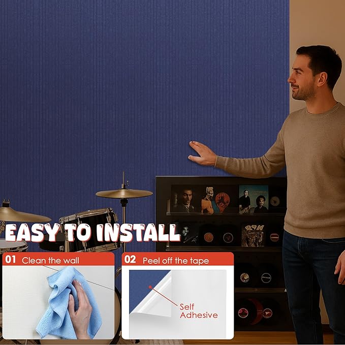 - đťăEASY INSTALLATIONă Super easy to install! With the self-adhesive design, you just need to tear off the top liner on the back and stick the sound proofing panels to the wall.