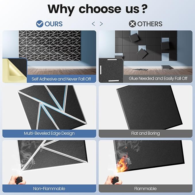 - 【Greatly Save your time and money !】our soundproof wall panels are self-adhesive,They can be installed to a variety of different surfaces (walls,doors,windows,ceilings and so on) without any tools.No need any other glue.Our acoustic panels come in 22-piece packs, which on average are cheaper than 18-piece packs acoustic panels