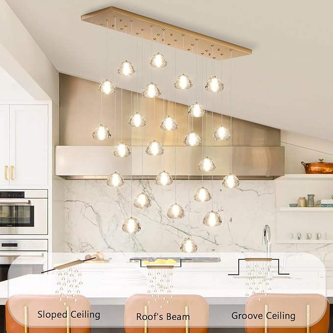 24-Lights Modern Crystal Rectangular Chandelier LED Raindrop Ceiling Pendant Light Crystal Lighting Fixture for Living Room Hotel Staircase Hallway Foyer Entryway Bedroom Gold