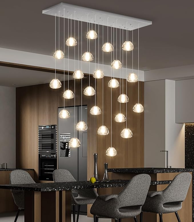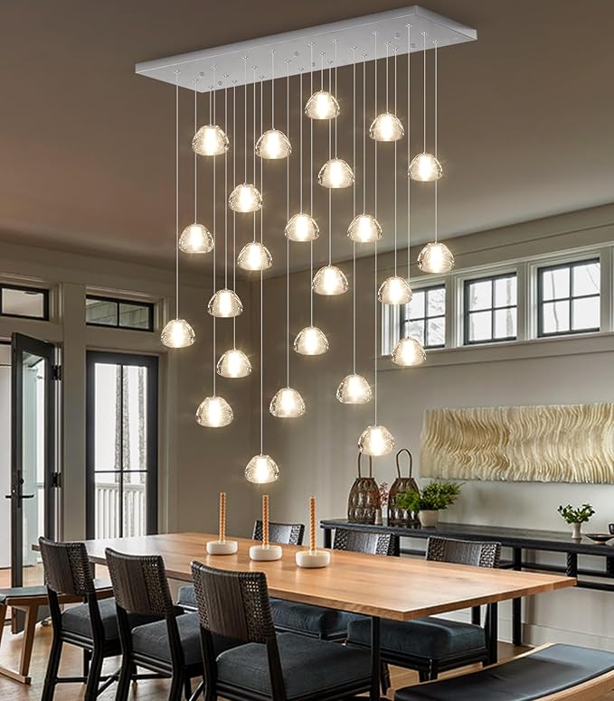 24-Lights Modern Rectangular Crystal Chandelier LED Raindrop Ceiling Pendant Light Crystal Lighting Fixture for Living Room Hotel Staircase Hallway Foyer Entryway Bedroom Silver
