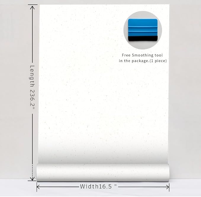 - Totally 4 layers of our material: 1.Waterproof and anti-stain protective layer. 2.Silver Powder&Vegetation fusion in paint. 3.Non-woven fabrics. 4.Self-adhesive sticker. Full size: width 16.5”x length 236.2",package size:3.38”x3.38”x17.1”. Free Smoothing tool in the package.(1 piece)