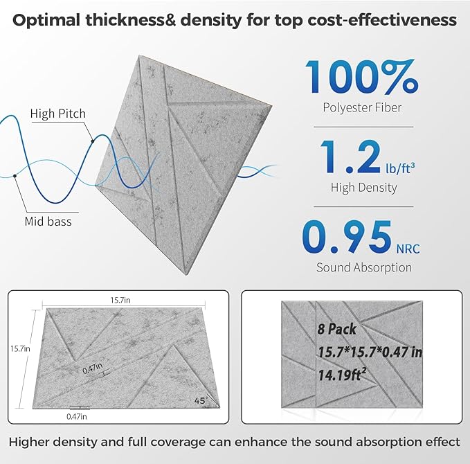 8 Pack Self-Adhesive Soundproof Wall Panels, 15.7 x 15.7 x 0.47 in Sound Proof Foam Panels for Walls, 1.2lb/ft³ High Density, Thicker 0.47in, Large Size Acoustic Panels, Sound Dampening Panels Gray