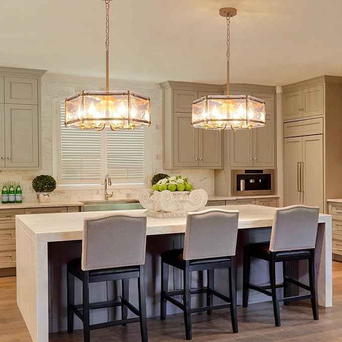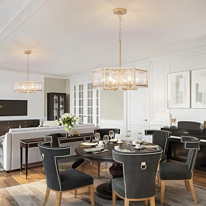 - đđăE12 Bulb Compatibility & Cozy AmbianceăCompatible with any E12 base bulb (up to 40 watts), this gold chandeliers for dining room offers dimmable lighting with the standard E12 bulbs (not included) and a dimmer switch (not included). The unique textured glass creates a warm, inviting ambiance, perfect for setting the mood with different bulb styles and temperatures