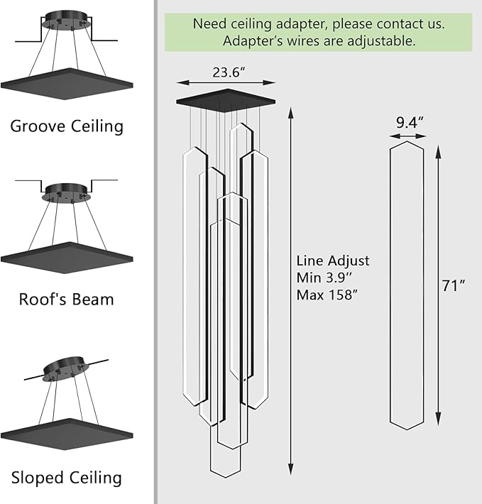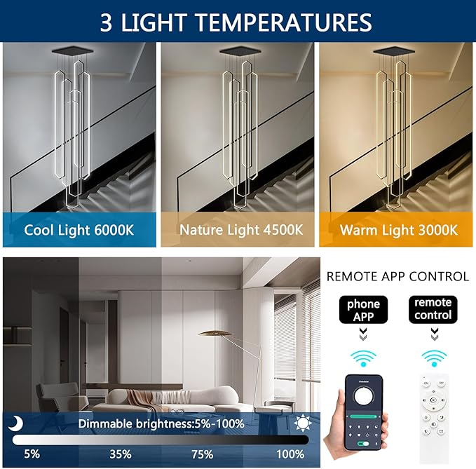 - 【Easy to Install Big Long LED Chandelier】All the pendants are pre-wired and pre-threaded, easy installation. The hanging wires will be a little slight bend when install. Don't worry, it will straightened after a while. All chandelier parts and accessories are provided, as well as instruction guide, please install the chandelier according to the steps