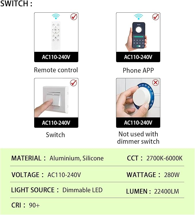 - 【Dimmable Black LED Chandelier Light Fixture】Brightness can be freely adjusted from 10-100% via remote control offered. The color tempearature dimmable range is 2700K-6000K. Three light modes: warm light, natural light, white light. The modern chandelier light fixture has built-in LED lights, which is with long service life over 50000 working hrs, can also save a lot of electricity. Power: 280W, Lumen: 22400, CRI up to 90, Voltage: 110-240V