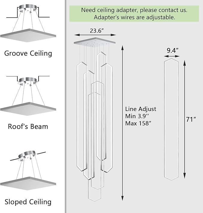 - 【Easy to Install Big Long LED Chandelier】All the pendants are pre-wired and pre-threaded, easy installation. The hanging wires will be a little slight bend when install. Don't worry, it will straightened after a while. All chandelier parts and accessories are provided, as well as instruction guide, please install the chandelier according to the steps