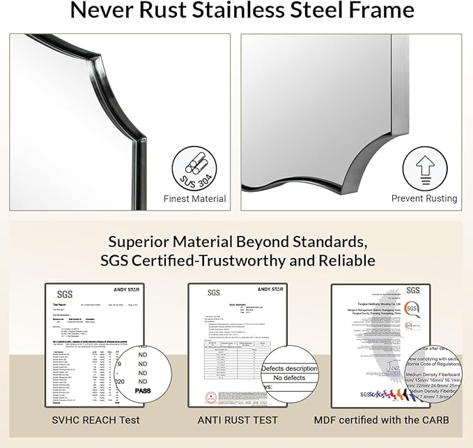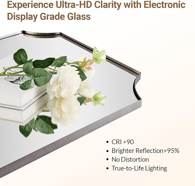 - 【Premium Stainless Steel Craftsmanship】: (N.W:24.7LBS). Crafted from stainless steel metal with oxidation-resistant properties, this mirror for bathroom offers enhanced stability and a longer lifespan. Shatterproof 4mm HD glass is supported by a 9mm MDF backboard (most others just 3mm ), surrounded by a 1/17" gap with a unique curved corner design to give a seamless finish