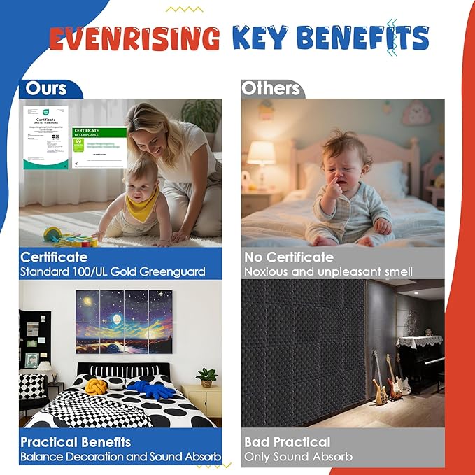 - [UNIQUE DESIGN] Compared to other art acoustic panel, our panels are safer. Don't have to worry about uncertified products affecting your health.Evenrising acoustic art made of 100% recycled material.