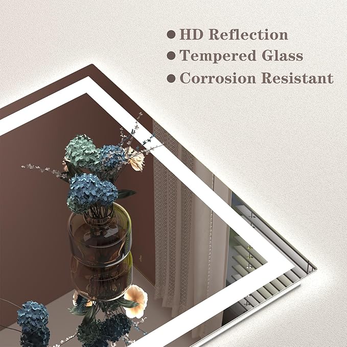 - Anti-Fog Mirror : With a defog film attached on the back of light up mirror, it will be heated and no fog will be produced on this led vanity mirror when the anti-fog function is on, you will have a very clear image even on the foggy bathroom; When the funtion is on, the screen buttont is in white color, when the function is off, it will be in color blue; The defogger will be turn off automatically after 1 hour if you forget it turn it off
