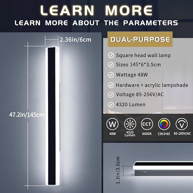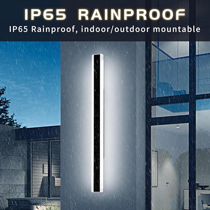 - IP65 OUTDOOR WALL SCONCE SPECIFICATIONS: 6000K Rectangular modern exterior lighting fixtures power is 48W, using 6000K cool white LED chips. Size is 57*2.36*1.37 inches, 23.6/31.4/39/47.2/57 inches available, designed for outdoor use with short circuit protection. It can withstand the wind and rain, with an operating temperature range of -15°C to +45°C. The lumen is about 4320