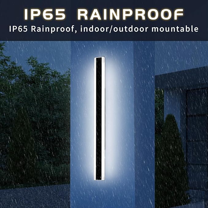 - IP65 OUTDOOR WALL SCONCE SPECIFICATIONS: 6000K Rectangular modern exterior lighting fixtures power is 42W, using 6000K cool white LED chips. Size is 47.2*2.36*1.37 inches, 23.6/31.4/39/47.2/57 inches available, designed for outdoor use with short circuit protection. It can withstand the wind and rain, with an operating temperature range of -15°C to +45°C. The lumen is about 3780