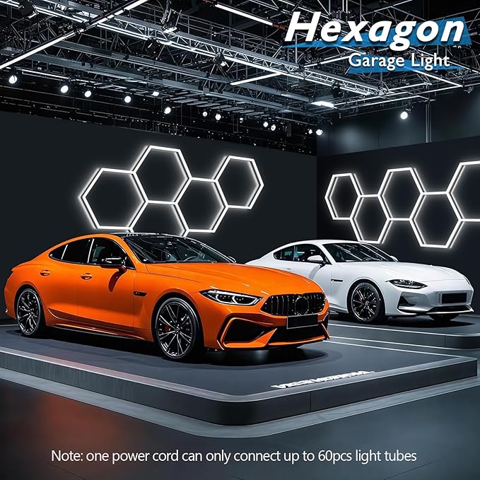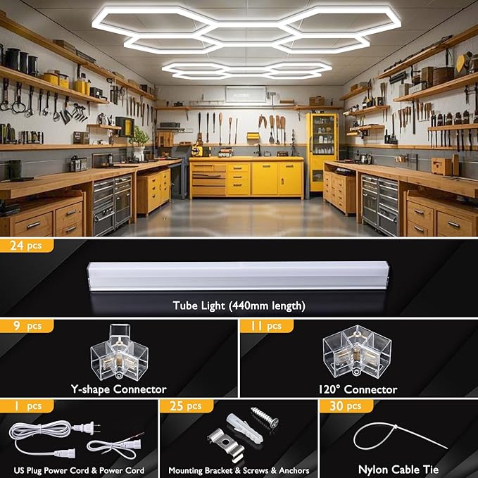 - High Brightness -This 192W hexagon car detailing light system with 6500K white light, produces an impressive brightness of 23040 lm, can effectively light up a large area, ideal for garage, car repair shops, workshops, workbench, or gym