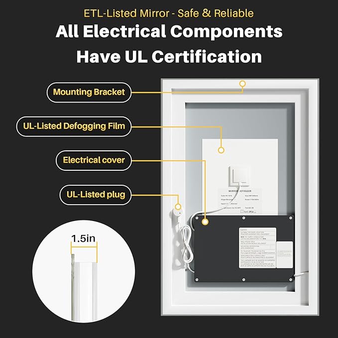 - [Anti-Fog Function]: The built-in defogger clears fog in minutes, starting at the center and spreading outward, keeping the lighted mirror crystal clear even in steamy bathrooms. It turns on with the power and shuts off automatically after 1 hour.