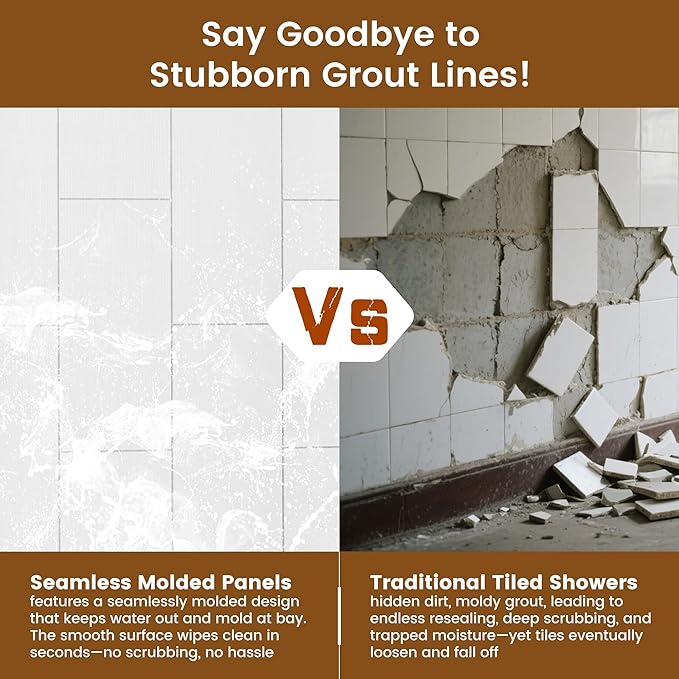 - ✅ Durable SMC Solid Surface:An upgrade from normal solid surface materials! Made from high-quality SMC solid surface, these shower wall panels resist chipping, peeling, and staining—offering both beauty and long-lasting durability. With low water absorption, they effectively prevent odors, sagging, and warping, even with daily use.