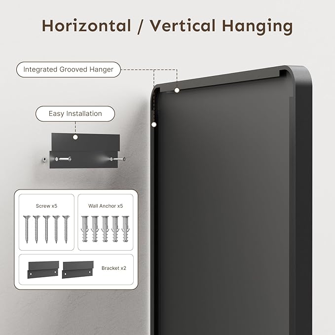 - šVersatile Mounting Options - Designed for both vertical and horizontal installation, this wall mounted mirror adapts to various settings, whether in bathrooms, bedrooms, entryways, or living rooms. All necessary mounting hardware is included for easy setup.