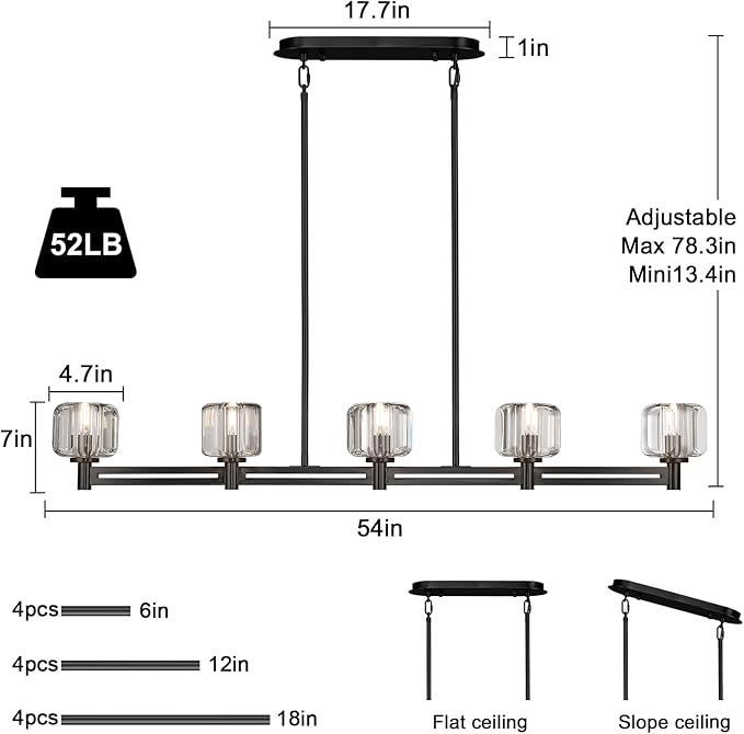 - 【ADJUSTABLE HEIGHT CHANDELIER】The modern crystal chandelier dimension is L54"xW4.7". With 5 crystals include 5pcs E12 bulbs(Included). Cable adjustable height: from 13.4" up to 78.3", allowing you to adjust it to your design and preference. Suitable for flat, sloped and vaulted ceilings.