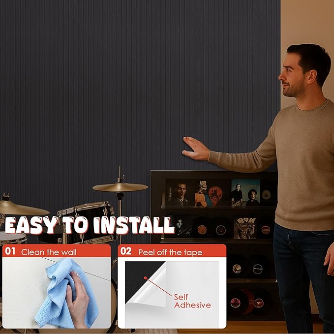 - đťăUpgraded Self -AdhesiveăSuper easy to install! With the self-adhesive design, you just need to tear off the top liner on the back and stick the sound proofing panels to the wall.