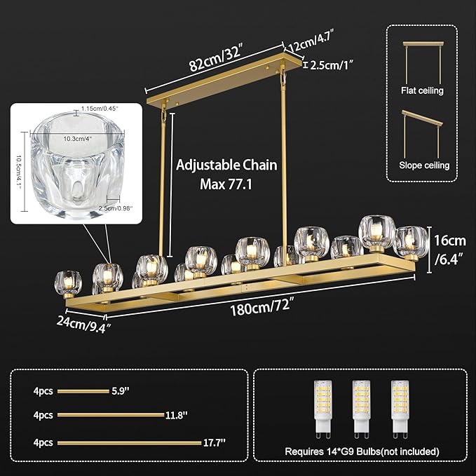 - 【14-Light Chandelier】Gold rectangle chandelier offers 360° light coverage to brighten your space & create a cozy vibe. The linear chandelier for dining room requires 14 G9 bulbs and available for infinite dimming via a dimmer. (Dimmable bulbs & dimmer not included).