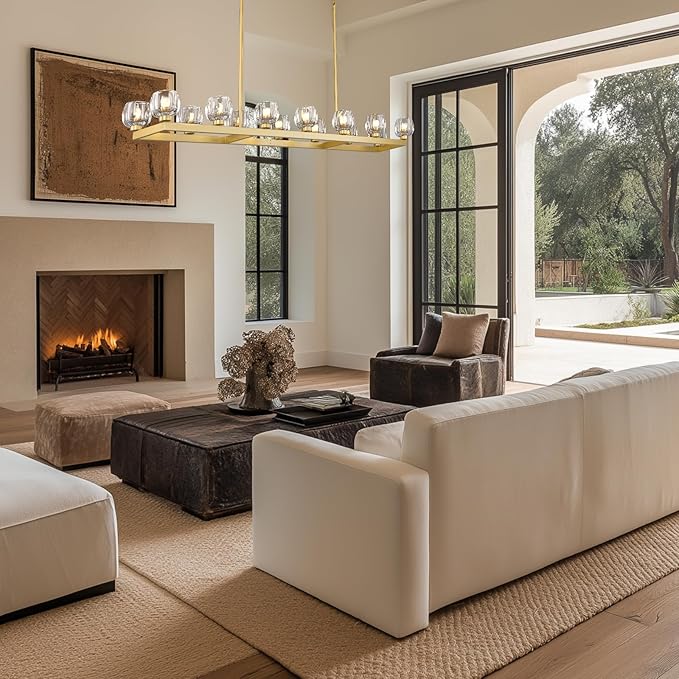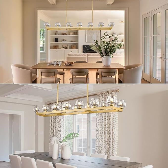 - 【Ideal for Various Scenes】Unique & Modern long chandeliers for dining room will enhance the beauty of your any space. Brass rectangular chandelier for dining room is perfect for your rectangular dining table, kitchen islands and more.