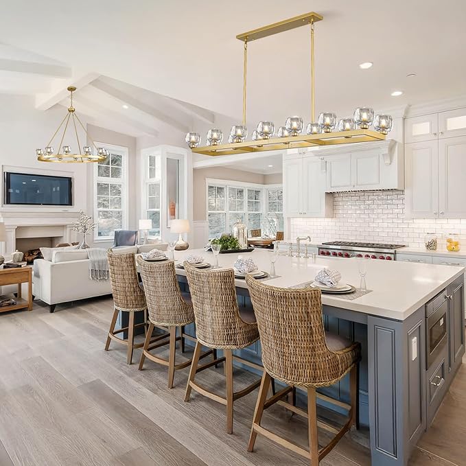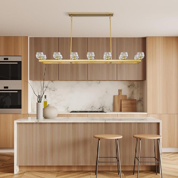 - 【Height Adjustable】Gold dining room chandelier over table measures 68 inches in length, 13.1 inches in width. It comes with 17.7-inch, 11.8-inch, and 5.9-inch rods, four of each size, max height is 77.1", weighs up to 62 pounds. Large modern chandeliers are heavy and need to be installed on a load-bearing ceiling. Perfect for modern minimalist aesthetics.