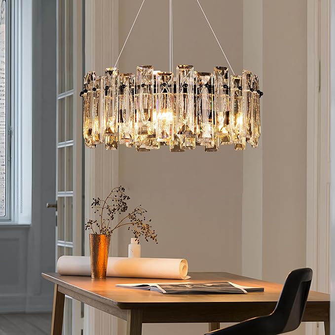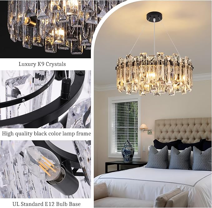 - Luxury Black Crystal Chandelier:The Puvaue modern black crystal chandelier features hand-polished K9 prism crystals with exceptional clarity and light-refracting properties, which can match perfectly with many decorative styles, and can bring an elegant atmosphere to light up your beautiful home.