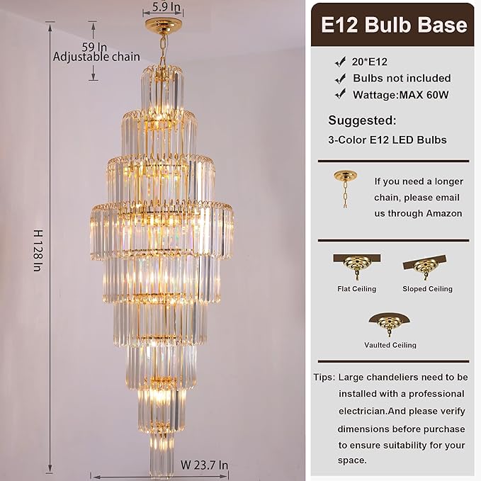 - Adjustable Chain Modern Large Chandelier Dimensions:Diameter 23.7 inches × Height 69 inches (excluding chain length).Adjustable chain length: 59 inches.Canopy dimensions: Diameter 5.9 inches × Height 1.97 inches.20pcs E12 bulb sockets (bulbs not included; LED recommended, max 60W per bulb).Voltage: 110-120V,Dimmable available when use dimmer bulbs with matched dimmer switch(not included).Weight: 70 lbs.Compatible with flat, vaulted, or sloped ceilings.Please verify dimensions before purchase to ensure suitability for your space.