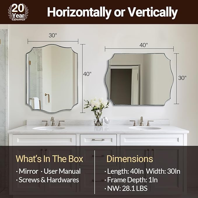 - 【Rust-Proof Stainless Steel Frame】: (N.W:28.1LBS). Crafted from stainless steel with oxidation-resistant properties, this chrome mirror for bathroom offers enhanced stability and a longer lifespan. Shatterproof 4mm HD glass is supported by a 9mm MDF backboard (most others just 3mm ), surrounded by a 1/17" gap with unique curved corner design to give a seamless finish