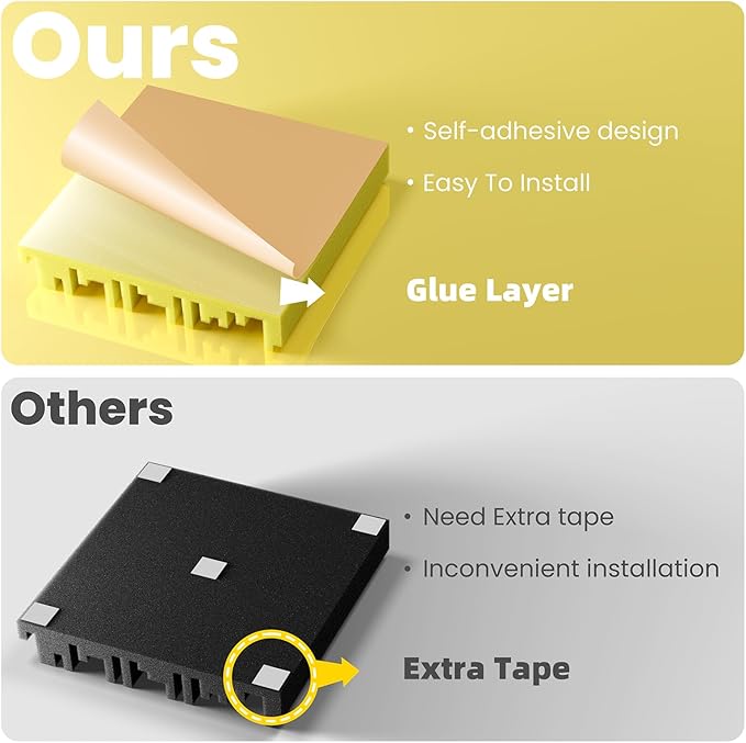 - Easy Peel & Stick Installation - Our soundproof foam panels come with pre-applied double-sided tape, making installation quick and hassle-free. Simply peel off the protective layer and stick the panels to any smooth surface—no additional tools or adhesives required. Perfect for DIY enthusiasts and professionals alike
