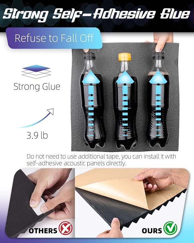 - 💚Upgraded Self- Adhesive: Upgrades LEIYER acoustic foam with high self-adhesive to make the easy installation without additional tape. If you press in the wall as well as you can, our self-adhesive tape prevents falling off.